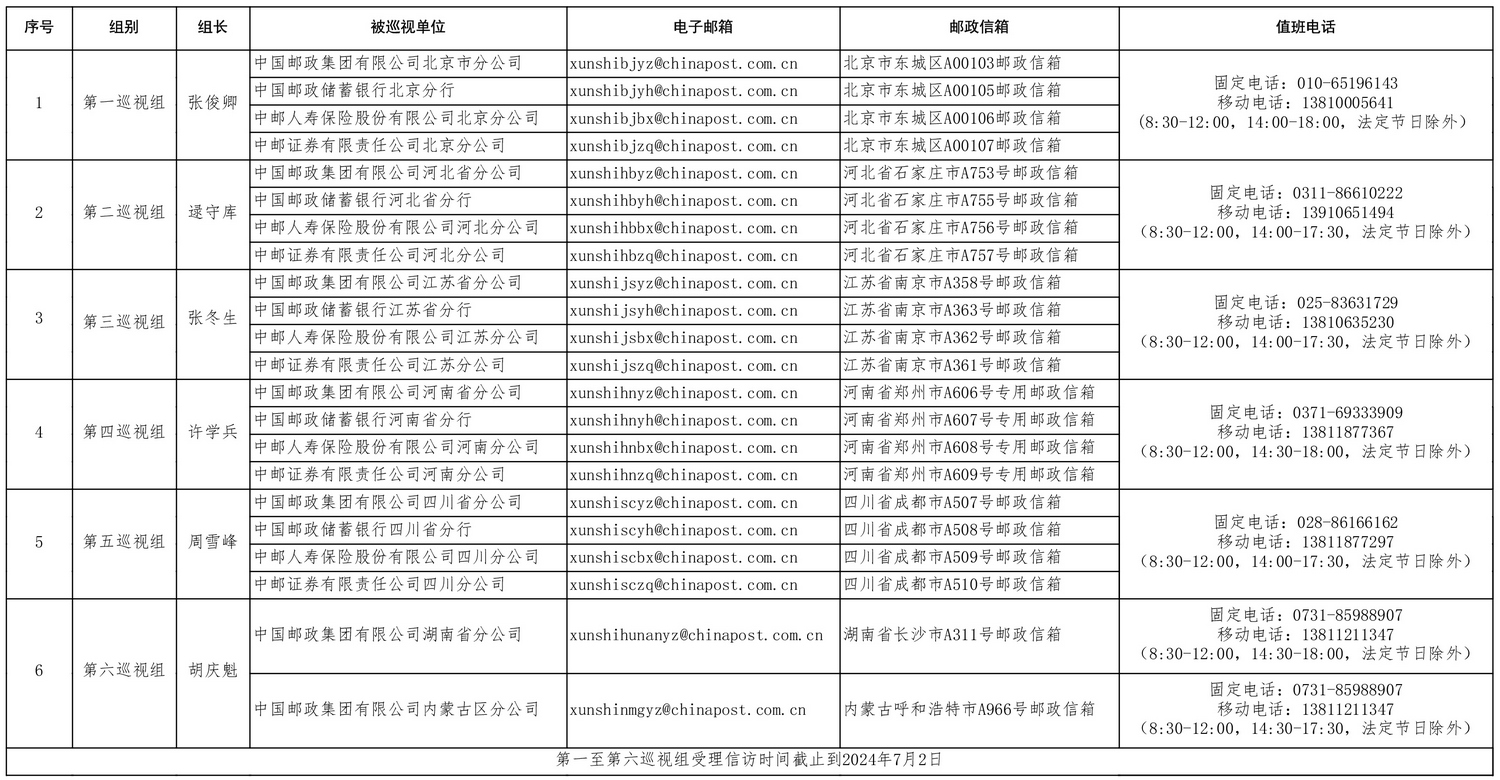 中國郵政集團(tuán)有限公司黨組2024年第一批巡視進(jìn)駐信息一覽表
