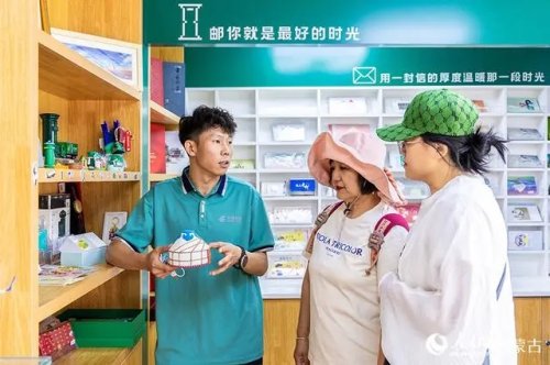 6月18日,工作人員在呼和浩特市玉泉區(qū)塞上老街旅游休閑街區(qū)“塞上主題郵局”內向游客介紹特色文創(chuàng)產品。