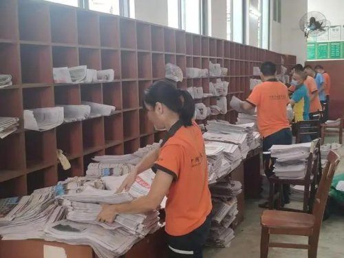 在澄邁縣郵政分公司郵件處理中心,分揀和投遞人員加班加點(diǎn),集體投入臺(tái)風(fēng)期間停運(yùn)的報(bào)紙分發(fā)和投遞工作中,確保第一時(shí)間將報(bào)紙投遞上門,展現(xiàn)郵政速度。