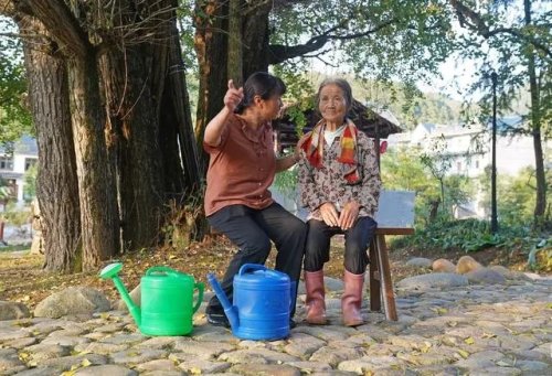 這是在江西省鉛山縣陳坊鄉(xiāng)沽溪村,羅細英(右)與相識的村民溫春香敘舊(9月28日攝)。新華社記者 萬象 攝