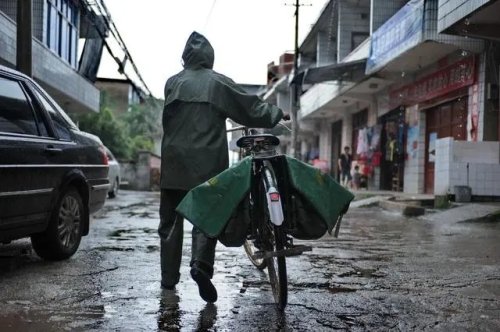 這是在江西省鉛山縣陳坊鄉(xiāng),羅細英冒著大雨騎車出發(fā)去送郵件(2011年7月19日攝)。新華社記者 周密 攝
