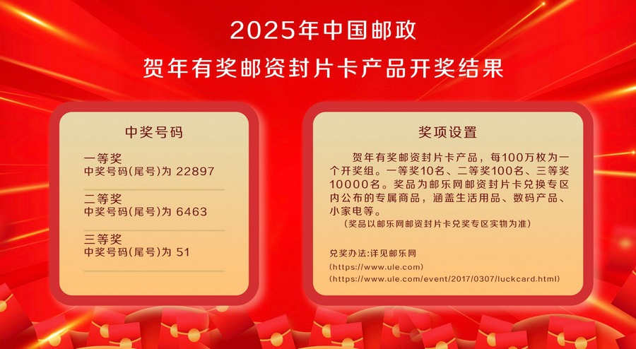 3月24日,2025年中國郵政賀年有獎郵資封片卡產(chǎn)品開獎結(jié)果產(chǎn)生。賀年有獎郵資封片卡產(chǎn)品每100萬枚為一個開獎組,每個開獎組設(shè)3個獎項(xiàng)。獎品為郵樂網(wǎng)郵資封片卡兌換專區(qū)內(nèi)公布的專屬商品,涵蓋生活用品、數(shù)碼產(chǎn)品、小家電等,以郵樂網(wǎng)郵資封片卡兌獎專區(qū)實(shí)物為準(zhǔn)。
