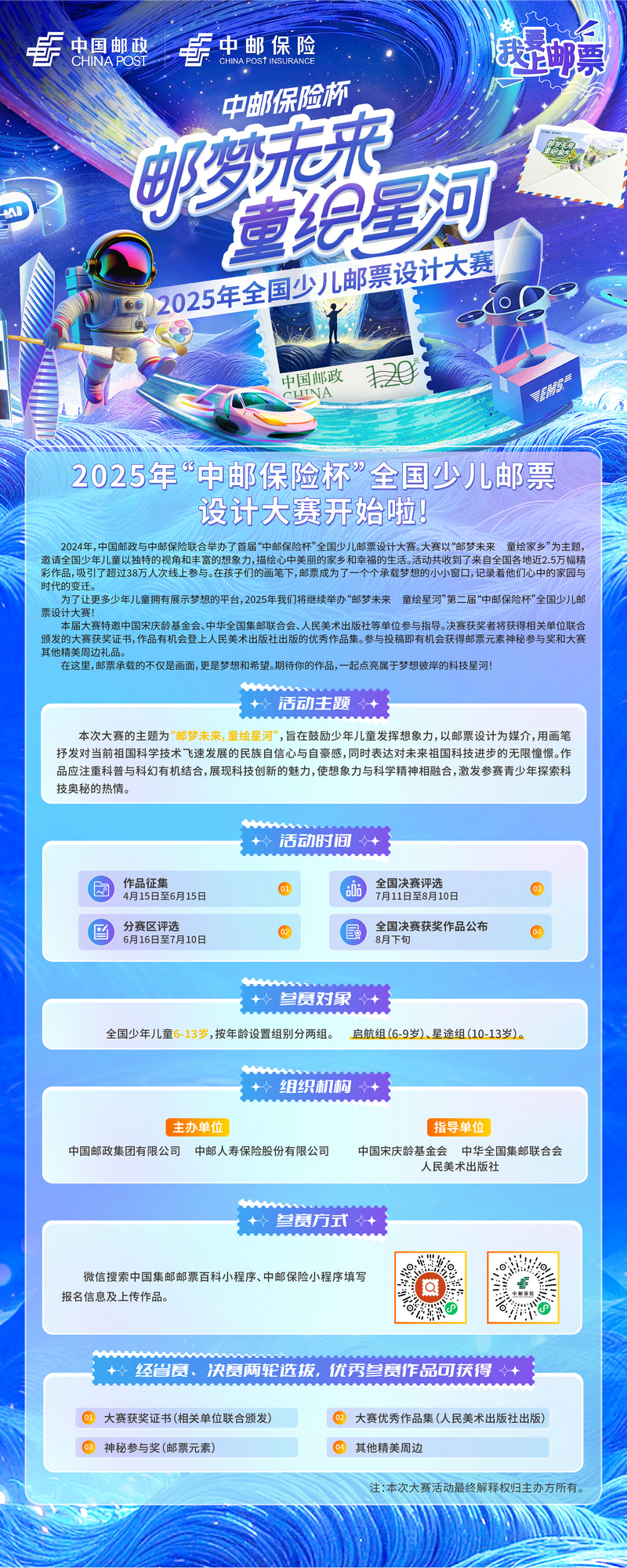 本次大賽的主題為“郵夢未來,童繪星河”,旨在鼓勵少年兒童發(fā)揮想象力,以郵票設(shè)計為媒介,用畫筆抒發(fā)對當(dāng)前祖國科學(xué)技術(shù)飛速發(fā)展的民族自信心與自豪感,同時表達(dá)對未來祖國科技進(jìn)步的無限憧憬。作品應(yīng)注重科普與科幻有機(jī)結(jié)合,展現(xiàn)科技創(chuàng)新的魅力,使想象力與科學(xué)精神相融合,激發(fā)參賽青少年探索科技奧秘的熱情。