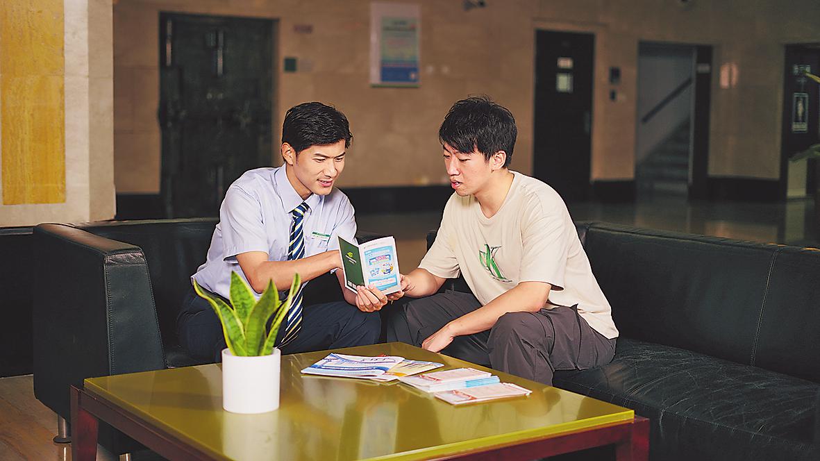 黃浦區(qū)支行營(yíng)業(yè)部理財(cái)經(jīng)理為客戶(hù)介紹理財(cái)產(chǎn)品。