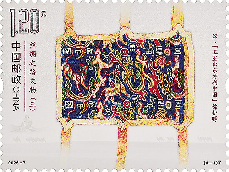 5月18日,《絲綢之路文物(三)》特種郵票發(fā)行。該套郵票一套4枚,郵票圖案名稱為:漢·“五星出東方利中國”錦護膊、南北朝·神人紋銀盤、北周·凸釘玻璃碗、唐·胡人牽駝載絲壁畫。