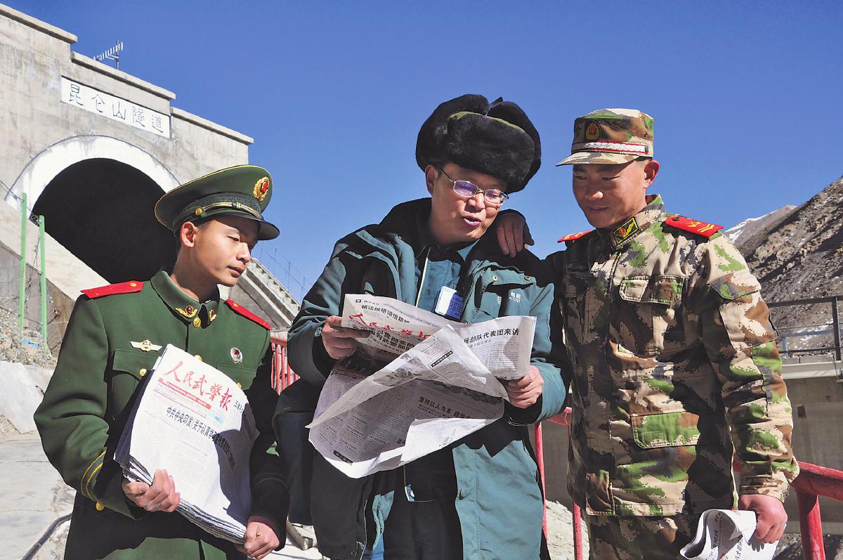 葛軍為駐守在昆侖山隧道的武警戰(zhàn)士送去報刊。