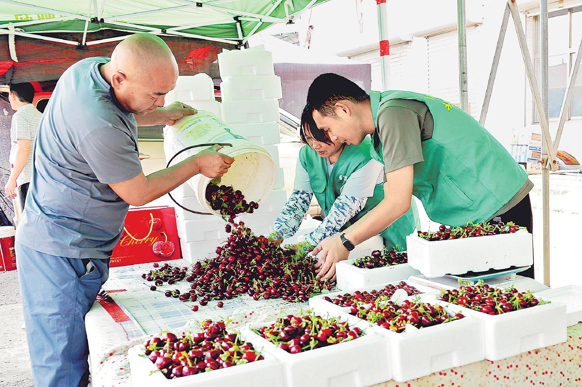 郵政員工幫助農(nóng)戶挑選櫻桃。