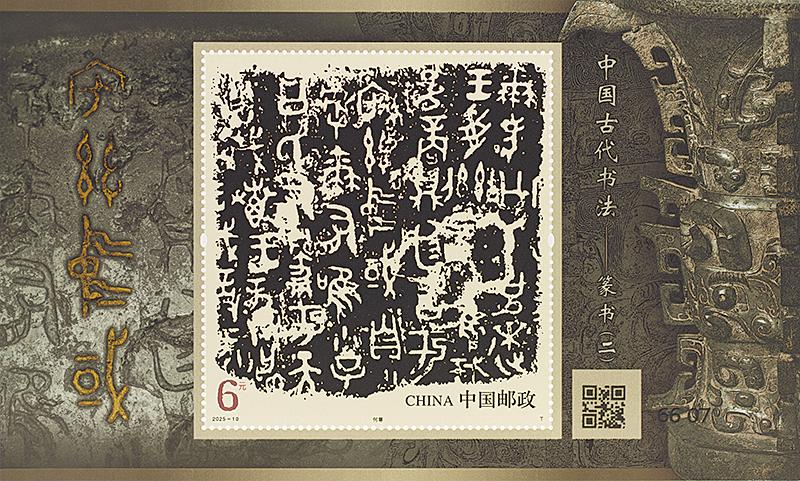 6月21日,《中國(guó)古代書(shū)法——篆書(shū)(二)》特種郵票將發(fā)行。該套郵票一套4枚,小型張1枚。郵票圖案名稱為“大盂鼎”“中山王舋鐵足鼎”“石鼓·吾車刻石”“瑯琊刻石”,小型張圖案名稱為“何尊”。