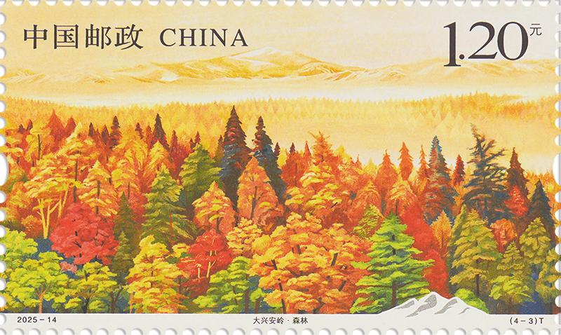 第一枚“濕地”表現(xiàn)了候鳥回歸、杜鵑花開時(shí)的濕地風(fēng)光,展現(xiàn)了大興安嶺良好的生態(tài)環(huán)境。第二枚“火山”表現(xiàn)了火山形成的天池風(fēng)光,展現(xiàn)了大興安嶺獨(dú)特的地理環(huán)境。第三枚“森林”(見上圖)表現(xiàn)了大興安嶺秋天的森林風(fēng)光,展現(xiàn)了浩瀚原始森林絢麗多彩的景色。第四枚“極光”表現(xiàn)了冬季天空出現(xiàn)絢麗極光的美麗景象,凸顯了高緯度地區(qū)的獨(dú)特天象。