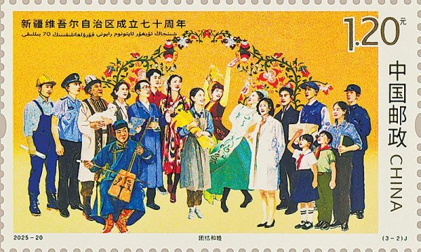 郵票圖案采用巖彩繪畫技法創(chuàng)作。第一枚“美麗新疆”,畫面主體為新疆城市美景,前景綻放的玫瑰代表塔克拉瑪干沙漠“鎖邊”工程,背景為昆侖山慕士塔格峰和卡拉庫(kù)里湖。第二枚“團(tuán)結(jié)和睦”,畫面表現(xiàn)了新疆各民族、各行業(yè)群眾團(tuán)結(jié)和諧、親如一家的場(chǎng)景。第三枚“開放高地”,畫面以中歐班列、霍爾果斯國(guó)門為主體,遠(yuǎn)景展現(xiàn)了烏魯木齊國(guó)際機(jī)場(chǎng)、光伏電站和博格達(dá)峰。郵票充分展現(xiàn)了在新疆這片美麗、廣袤的土地上,傳統(tǒng)與現(xiàn)代交織,自然與人文共生,古老與青春共舞;生動(dòng)描繪了各族群眾獲得感、幸福感、安全感不斷增強(qiáng)的美好圖景,各族群眾像石榴籽一樣緊緊抱在一起,在中國(guó)式現(xiàn)代化進(jìn)程中更好建設(shè)團(tuán)結(jié)和諧、繁榮富裕、文明進(jìn)步、安居樂業(yè)、生態(tài)良好的美麗新疆。
