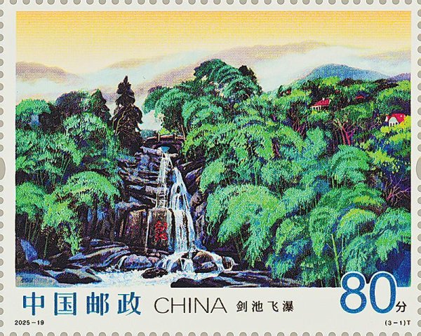 第一枚“劍池飛瀑”(見圖),敘述了莫干山的古老傳說。郵票畫面聚焦劍池瀑布自蒼崖飛瀉而下的剎那,與周邊環(huán)繞的茂林翠柏、蒼巖石壁共同講述干將、莫邪鑄劍的傳奇故事。第二枚“群墅點翠”,呈現(xiàn)了莫干山的建筑風(fēng)貌。此枚郵票將掩映在翠竹間眾多風(fēng)格各異的別墅盡收眼底,別墅群落依山就勢,錯落層疊,紅瓦青磚與修竹勁松相映成趣。第三枚“旭光云海”,描繪了莫干山的日出景象。該枚郵票定格了莫干山旭日東升的壯麗景象,旭光臺作為莫干山觀賞日出的絕佳觀景臺,將天地交輝的盛景盡收眼底。