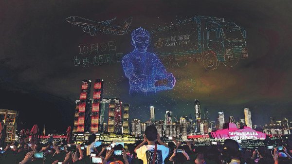 10月4日20時30分,重慶市南濱路上空,一場以第56屆世界郵政日為主題的無人機燈光秀璀璨上演。數千架無人機以天為幕,在長江上空編織出郵遞員風雨無阻、使命必達,郵政金融員工溫馨服務、連接美好以及重慶地標明信片詮釋山河情誼的影像。現場,來自全國各地的游客及重慶市民駐足觀看,紛紛用手機拍下這精彩瞬間。孩子們指著天空歡呼:“看,天上有郵遞員在飛!”這場科技與溫情交融的視覺盛宴,展現了中國郵政的現代化形象,讓群眾在節日的歡樂中感受到郵政服務的溫度與堅守。