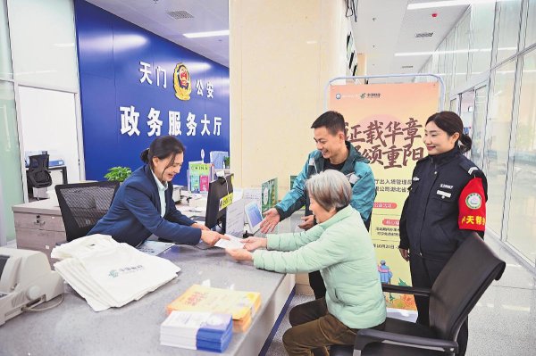 活動期間,湖北省年滿60周歲的老年申請人在辦理出入境證件時,均可享受“一免三優”的全流程便利服務。“一免”即提供出入境證件免費寄遞到家服務,“三優”指優先取號、優先辦理和優先寄遞。圖為天門市郵政分公司在該市政務服務中心出入境窗口設置駐點專員為老年客戶提供免費寄遞服務。