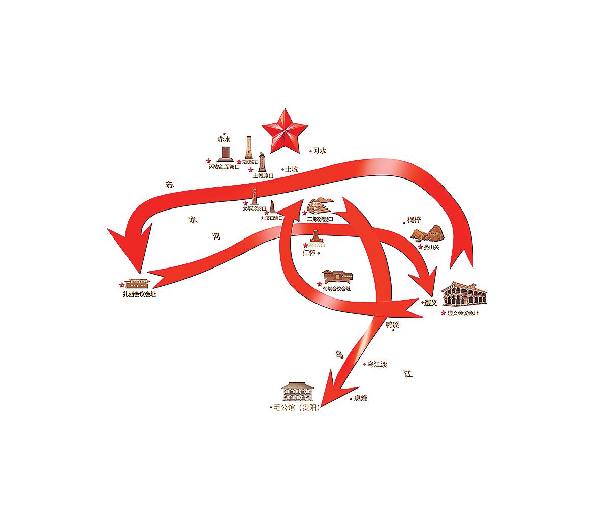 唐云云介紹,將紅軍“一渡赤水”(遵義—土城—扎西)、“二渡赤水”(扎西—太平渡—婁山關—遵義)、“三渡赤水”(遵義—茍壩—茅臺—川南)、“四渡赤水”(二郎灘—太平渡—貴陽)的迂回路線在地圖上連線,驚訝地發現其天然構成了一個“安”字的輪廓。“我們在‘安’字頭上加了一顆五角星,這既是革命精神的象征,也含平安的寓意。希望游客看到時,能想到當下的幸福生活來之不易。”唐云云說。