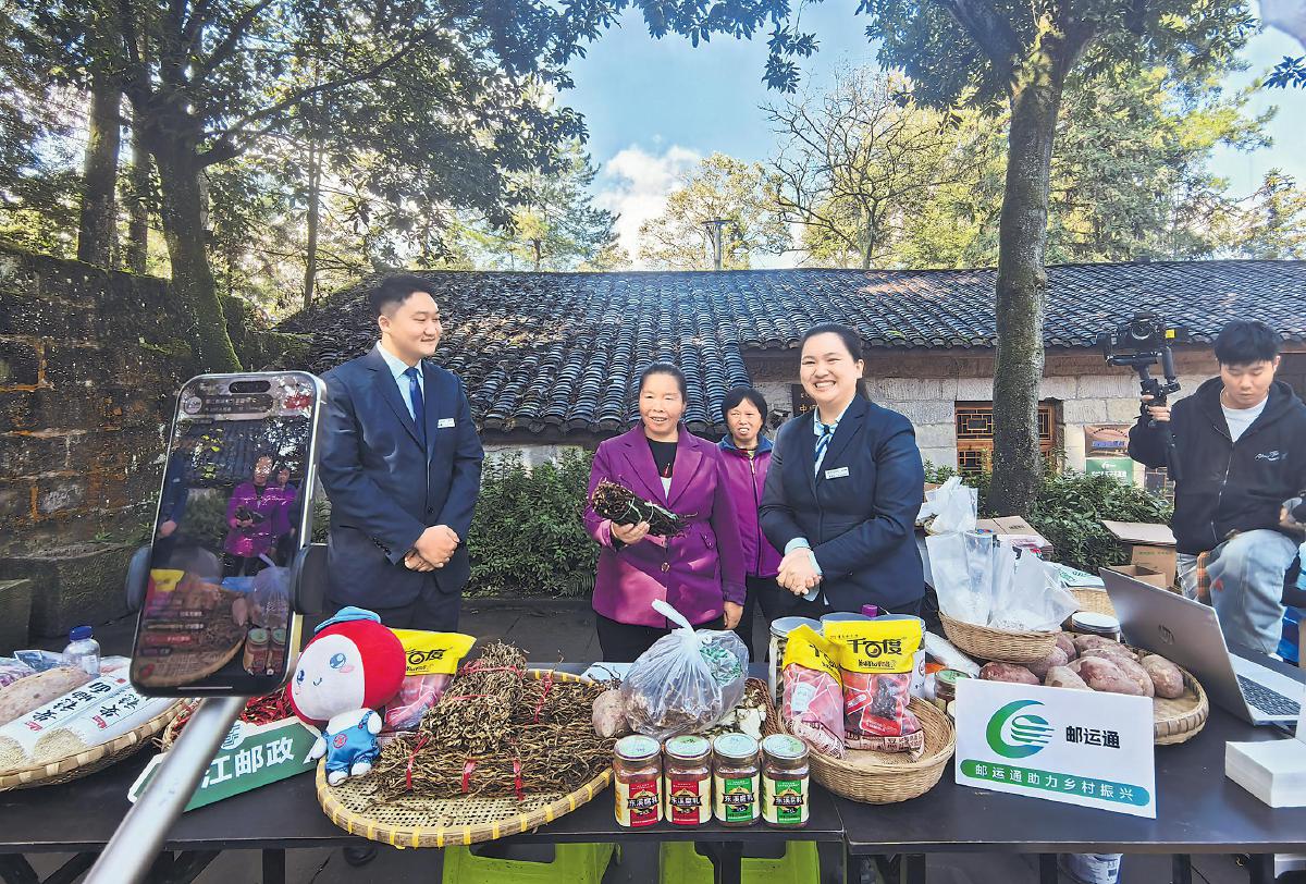 近日,在重慶市綦江區中壩村村委會的小院里,郵政工作人員與村民圍在擺滿干辣椒、干貨、特色醬料的展臺前,對著手機直播鏡頭熱情推介當地好物。在全市推進“郵運通”工作的助力下,綦江區郵政分公司開通“郵車到我家”專線,并在今年4月聯合區商務委構建“產地首發—冷鏈運輸—終端配送”全鏈條服務體系,實現山鄉特產“當日采收、次日達城”,為農村電商發展提供有力支撐。