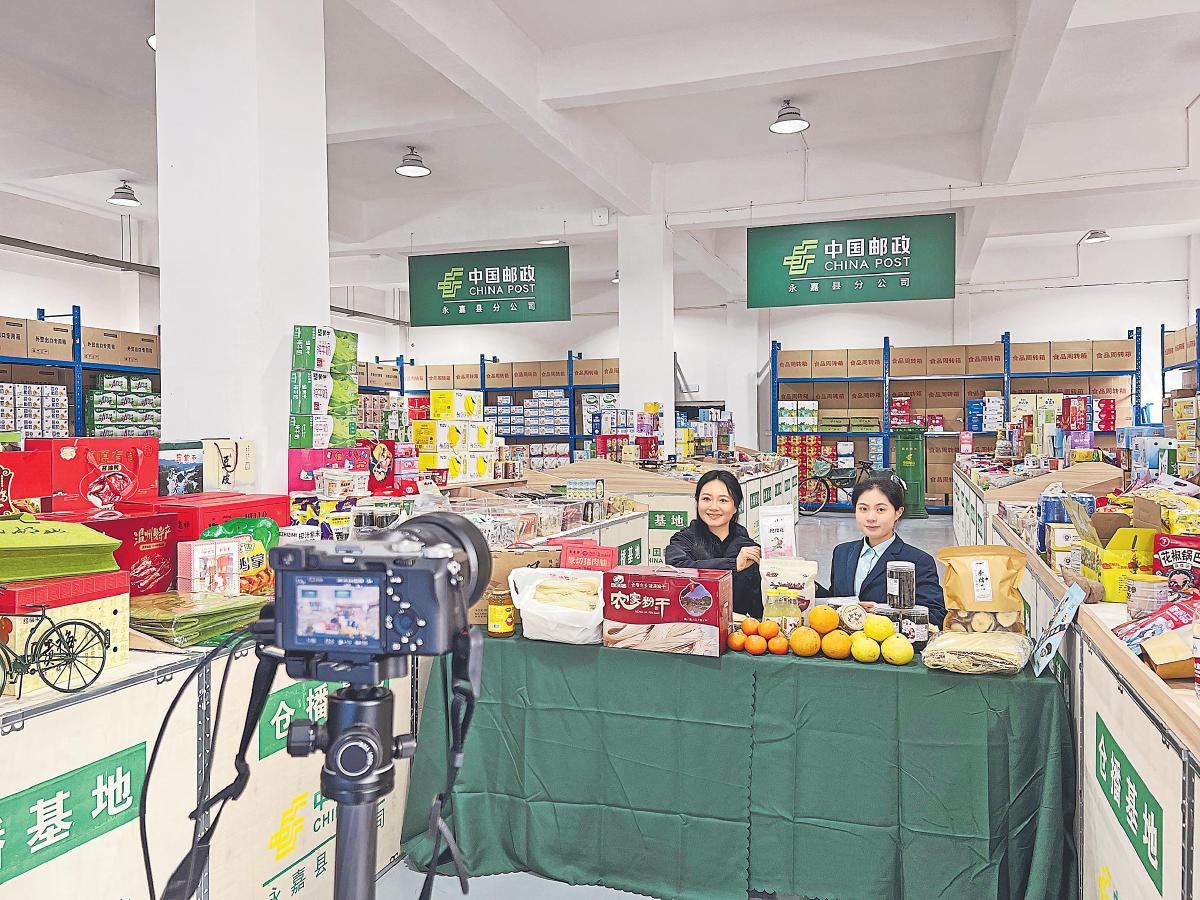 永嘉郵政組織“郵樂小店”店主在倉儲中心進行直播。 □周欣新 攝