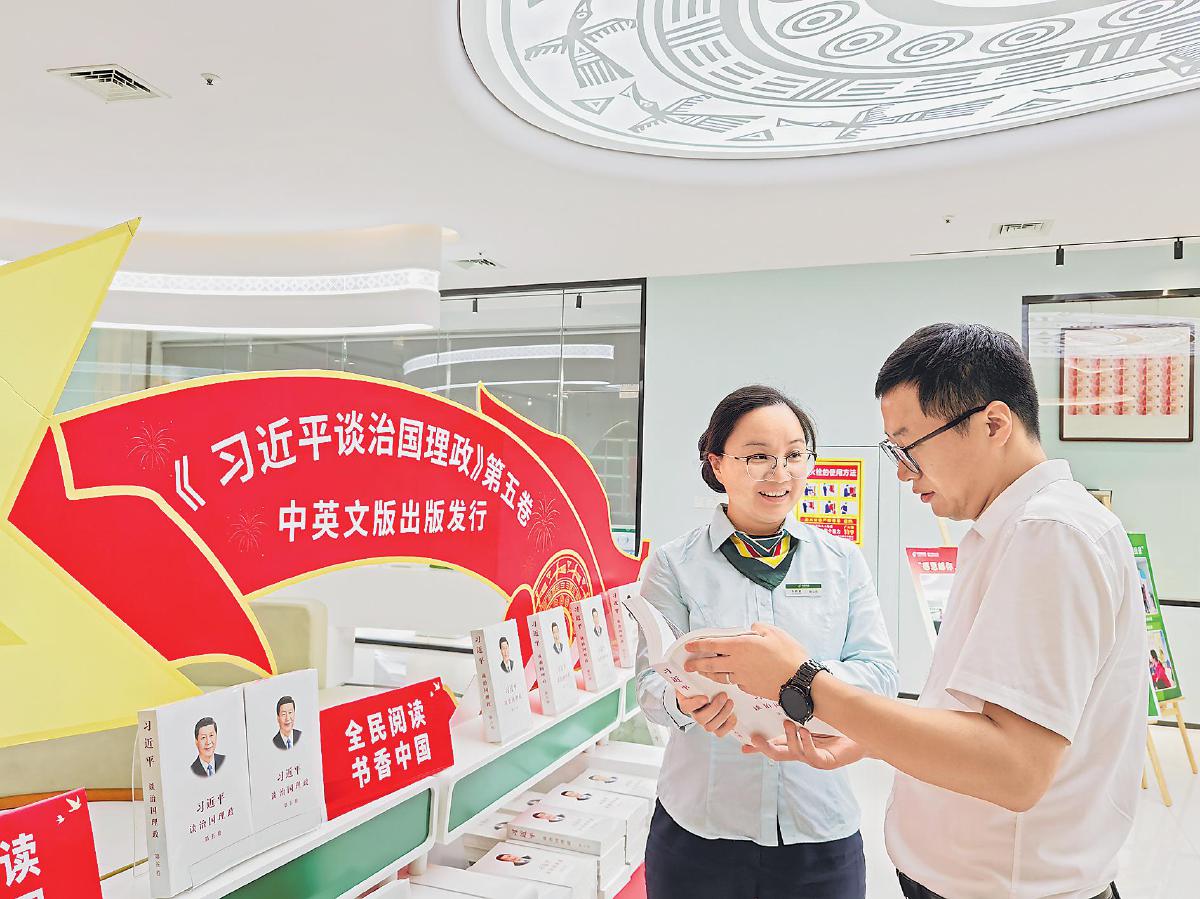 近日,走進(jìn)廣西壯族自治區(qū)南寧市金浦路郵政支局,一抹鮮艷的紅色映入眼簾,紅色背景的展板下,整齊排列著《習(xí)近平談治國理政》第五卷圖書。不少讀者在此駐足,有的神情專注地翻看,有的在聆聽工作人員介紹。市民張先生在選購圖書的人群里格外顯眼,他不僅自己購買,還打算幫家人和朋友代買。他表示,自己是一名黨員,《習(xí)近平談治國理政》第五卷圖書對提升黨性修養(yǎng)和理論素養(yǎng)大有裨益?!霸卩]政網(wǎng)點能夠買到正版重點圖書,十分方便,工作人員很貼心地向我介紹圖書的信息?!睆埾壬f。