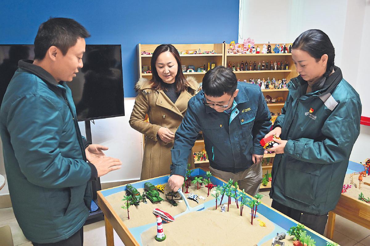 在昆明郵區(qū)中心,心理導師向員工介紹“心理沙盤”的使用方法?! 踮w焱 攝