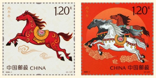 《丙午年》特種郵票全套共2枚。第一枚圖名為“馳躍宏圖”,圖中紅馬踏云、鬃毛如焰,表達(dá)了在新的一年里,對(duì)黨全面領(lǐng)導(dǎo)下國家經(jīng)濟(jì)社會(huì)發(fā)展繼續(xù)行穩(wěn)致遠(yuǎn),向著“十五五”時(shí)期主要目標(biāo)接續(xù)奮進(jìn)的美好期許。第二枚圖名為“萬駿臻福”,圖中三駿并馳、祥紋環(huán)繞,象征全國各族人民凝聚磅礴合力,在全面建設(shè)社會(huì)主義現(xiàn)代化國家、全面推進(jìn)中華民族偉大復(fù)興征程上協(xié)力同心。