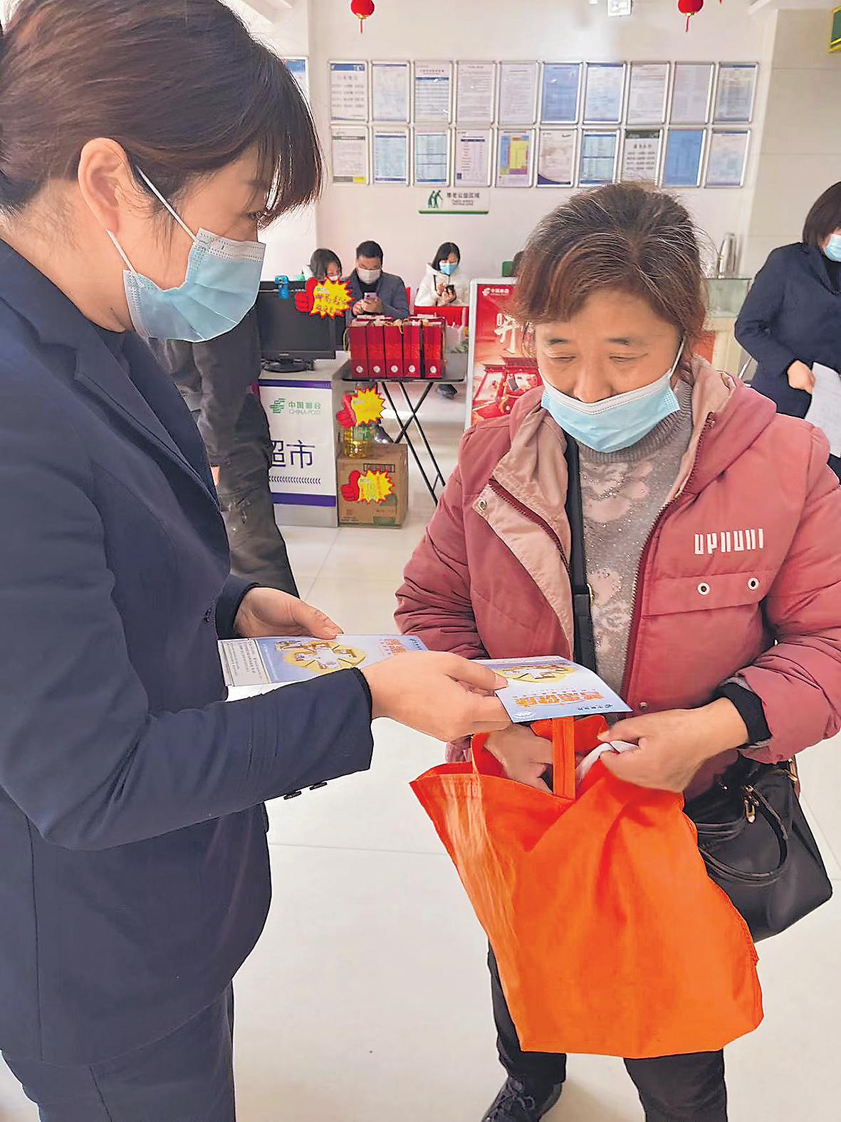 針對(duì)老年群體需求,郵政工作人員宣傳定制化普惠保險(xiǎn)業(yè)務(wù)。