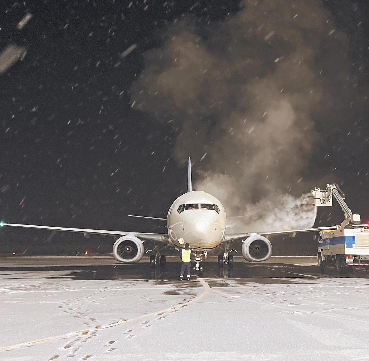 1月29日深夜,郵航機務人員在新疆石河子花園機場指揮除冰車噴灑除冰液,保持飛機適航狀態(tài)。1月4日,石河子至南京“極速鮮”航線開通,助力當地軍墾農牧產品走向全國。面對冬季的寒冷與降雪,郵航機務團隊克服天氣影響,以專業(yè)維護確保航班不受低溫影響,守護著連接牧場與市場的“空中橋梁”。
