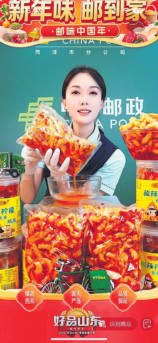 2025年11月,菏澤郵政啟動(dòng)“年貨節(jié)”專項(xiàng)策劃,建立市、縣郵政聯(lián)動(dòng)的選品機(jī)制,緊跟節(jié)日消費(fèi)趨勢(shì)與網(wǎng)民偏好,在暢銷的酸辣無骨雞爪的基礎(chǔ)上,新增佤味雞爪等品類,持續(xù)優(yōu)化產(chǎn)品組合,精準(zhǔn)對(duì)接市場(chǎng)需求。
