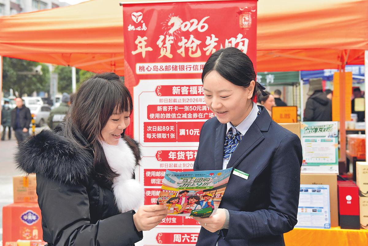 1月23日,陜西省漢中市“陜亮生活 惠購漢中”新春年貨購物節(jié)現(xiàn)場,郵儲銀行漢中市分行工作人員為消費者詳細介紹“年貨搶先購”優(yōu)惠活動。該分行通過開展惠民金融宣講、特色產(chǎn)品展示及互動體驗等形式,為市民送上新春“金融禮包”,以金融“活水”精準支持消費市場,助力市民樂購年貨、溫暖迎春,有效激發(fā)地方消費活力。