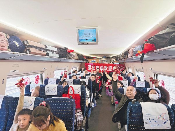 2月4日,G3724次高鐵上,重慶郵政工作人員陪伴老鄉(xiāng)返鄉(xiāng)過年?! 跷很啊z
