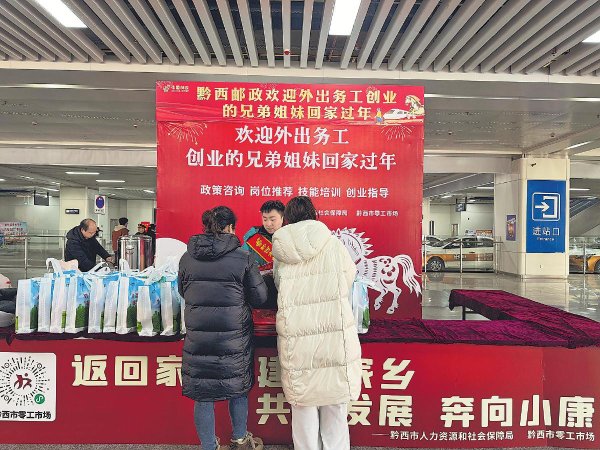 2月2日,貴州省黔西市郵政分公司聯(lián)合人社部門,在高鐵站為返鄉(xiāng)人員提供暖心服務(wù)?! 跣啞z