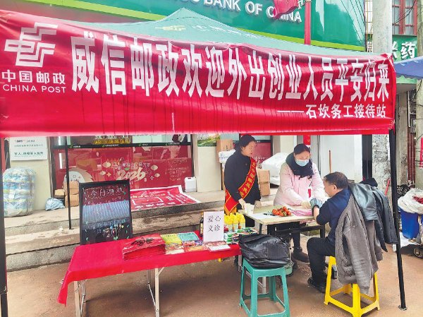 2月10日,云南省威信縣郵政分公司設(shè)立接待站,為返鄉(xiāng)人員提供義診服務(wù)?! 踵嵣ァz