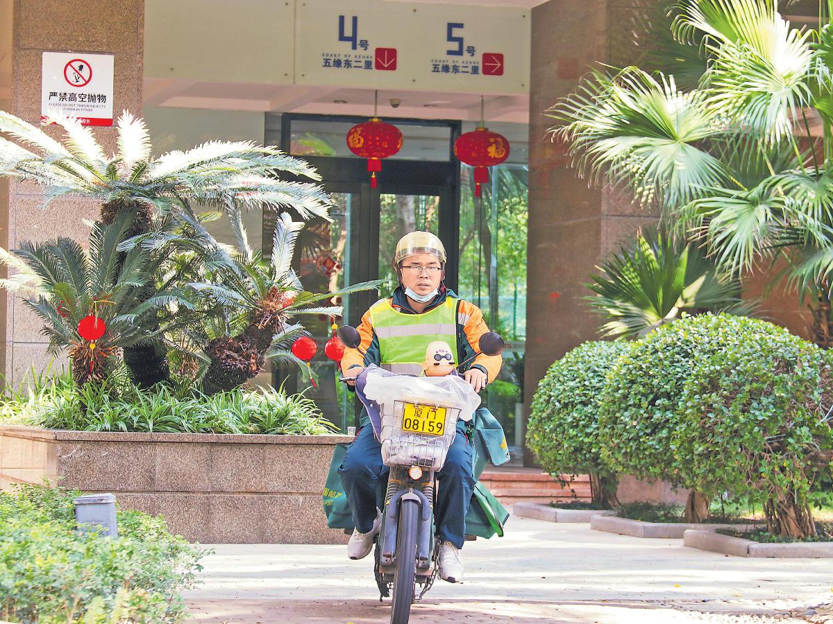 蔡加杰在小區(qū)內(nèi)投遞。