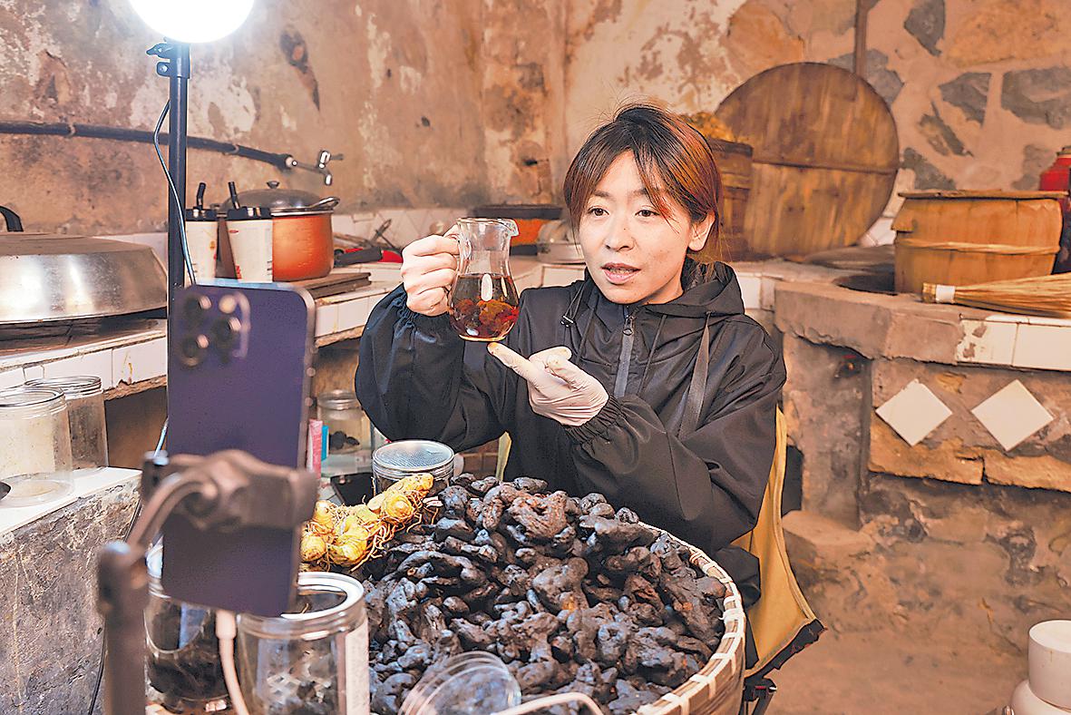 在景寧縣鸕鶿鄉(xiāng)徐崇村,清晨的薄霧還未散盡,主播“@鄉(xiāng)村夏天”的直播間已經(jīng)熱鬧起來(lái)了,直播鏡頭對(duì)準(zhǔn)從村民手里收購(gòu)來(lái)的剛蒸曬好、泛著烏潤(rùn)光澤的九制黃精。主播拿起一片黃精,對(duì)著燈光展示其飽滿厚實(shí)的肉質(zhì):“家人們快來(lái)看啊!這就是我們山里遵循古法、九蒸九曬后正宗黃精的模樣,黑如漆、亮如油,口感糯甜,補(bǔ)力醇厚……”只見(jiàn)她輕輕掰開(kāi),深褐色的斷面透著晶瑩的質(zhì)感,湊近鏡頭,仿佛能聞到那股獨(dú)特的藥香與甜香交織的氣息。評(píng)論區(qū)瞬間被點(diǎn)燃:“這才是地道貨!”“上次買(mǎi)來(lái)燉湯,全家都說(shuō)好!”“今天能發(fā)嗎?老客戶都等著這批好貨呢!”……一旁,主播的父親老練正根據(jù)手機(jī)里不斷跳出的訂單信息,麻利地將黃精稱重、包裝、入箱。