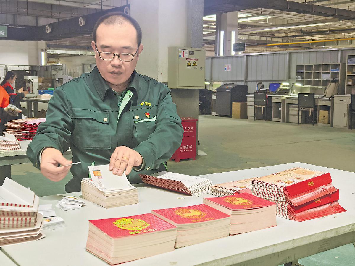 手工封裝車間是最忙碌的區(qū)域之一。“封好這條不到20厘米長(zhǎng)、不足2厘米寬的封舌,其實(shí)很考驗(yàn)功夫。封口不牢,郵寄途中可能散開;膠水多了,又可能粘連郵戳或地址。所以,每一封都得手工操作,膠水量必須恰到好處?!笔止し庋b車間班長(zhǎng)馬寅東介紹起團(tuán)隊(duì)的獨(dú)門訣竅。他帶領(lǐng)團(tuán)隊(duì)在信封到貨后反復(fù)測(cè)試,摸索出最合適的膠水用量和晾干時(shí)間。在封裝過(guò)程中,工作人員還要逐一核對(duì)明信片數(shù)量和附帶的貼紙,輕輕按壓封口,確保嚴(yán)絲合縫,再整齊擺放、晾干后分批裝箱。