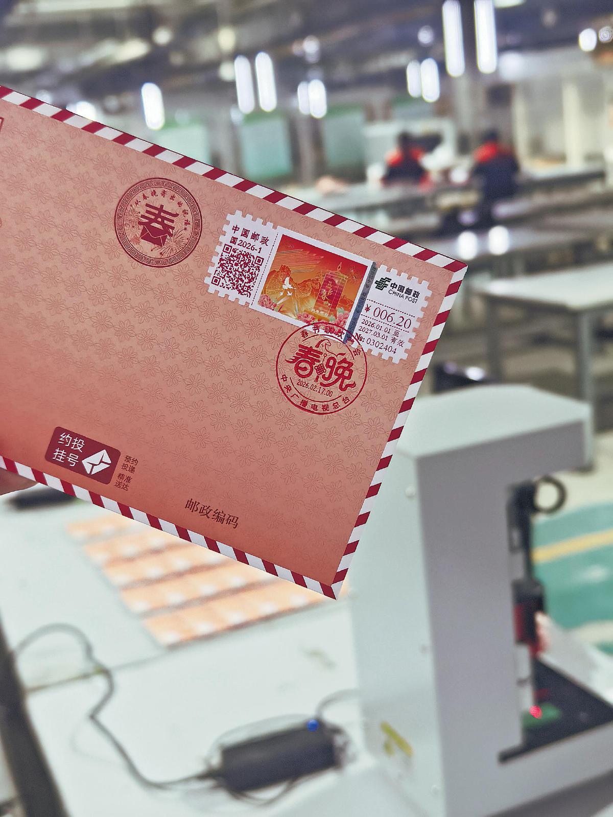 自1月初至除夕當(dāng)天,所有通過(guò)線上下單的“2026年春晚寄?!奔o(jì)念封套裝,正陸續(xù)在這里完成打印、封裝、蓋戳和郵寄。