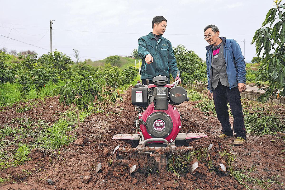 3月12日,江津區(qū)郵政分公司工作人員在油溪鎮(zhèn)大坡村為村民講解耕地機(jī)操作,以科技賦能春耕生產(chǎn)。 □王春蘭 攝
