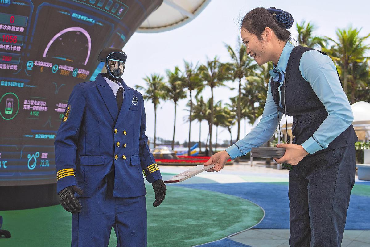 郵政工作人員與服務(wù)博鰲年會的智能機(jī)器人現(xiàn)場互動?! 蹶悗煛z
