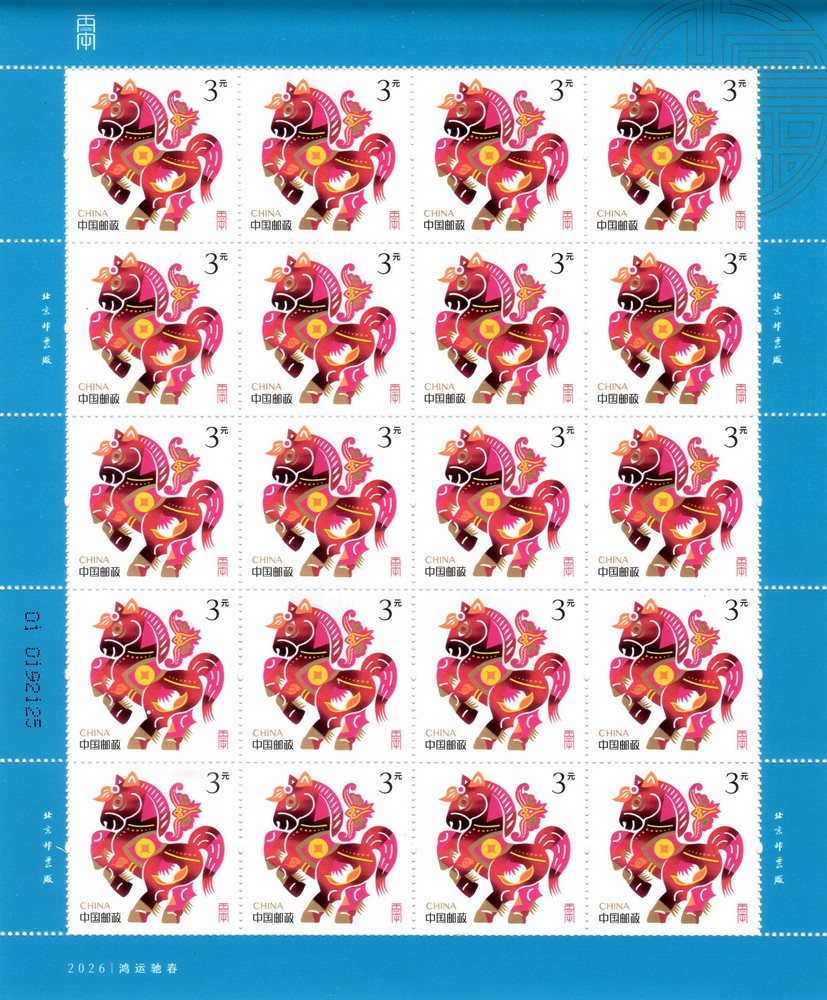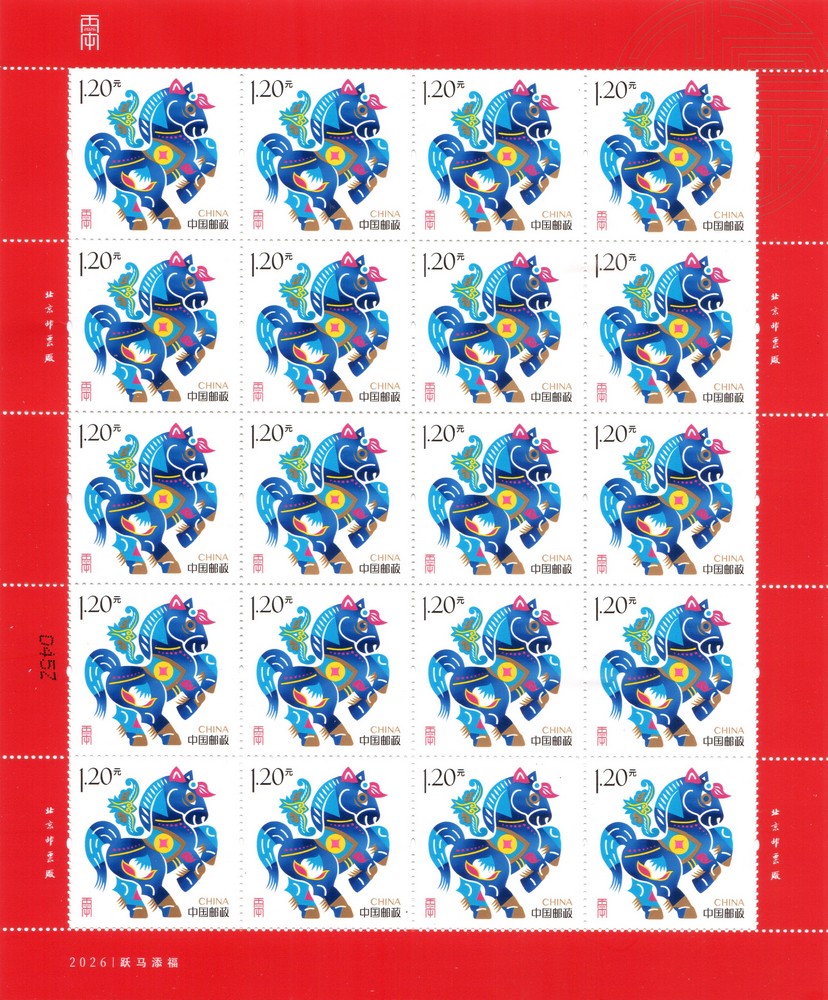 注:采用“躍馬添?!焙汀傍欉\(yùn)馳春”郵票印制小全張1枚,規(guī)格為120×190毫米。小全張專用于2026年中國(guó)郵政賀年有獎(jiǎng)產(chǎn)品(祝福卡型15元)。